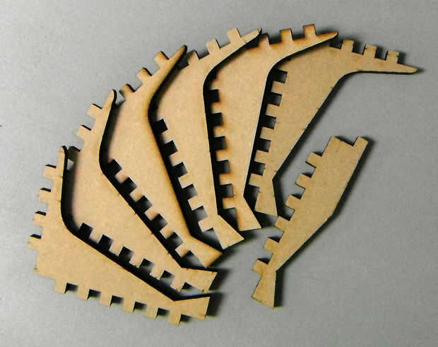 El fichero de pieza entonces fue optimizado por engranando las piezas diferentes para minimizar el tiempo de corte. Las imágenes adjuntas muestran la colección de recortables de piezas.