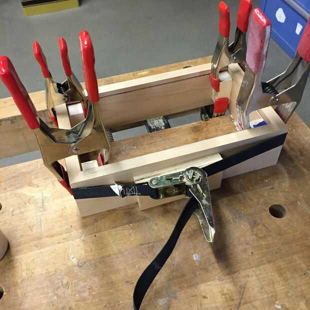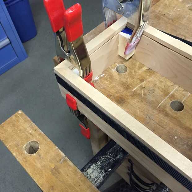 Así que pegué sólo dos de las cuatro esquinas de cada caja: dejé de lado largo sin pegar, aunque pegar los cuatro tirantes; dos de ellos aceptan tornillos que fijan la parte arrastrada. Nota la cinta azul en el puente de la plaza en la primera foto: esto fue para detener cualquier pegamento que se filtra desde el soporte que se pega al lado arrastrado.