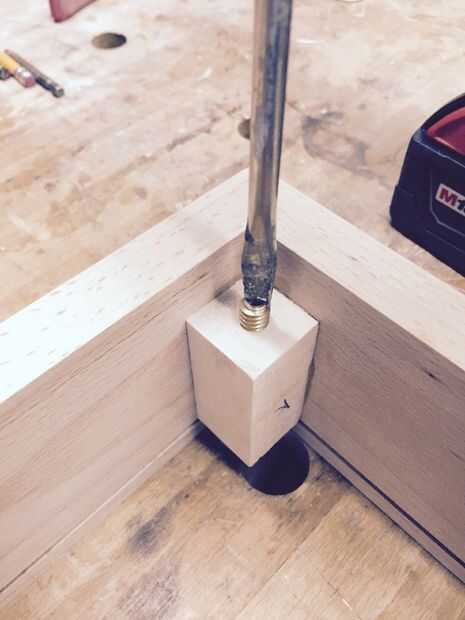 Porque las obras son con pilas, es importante ser capaz de eliminar fácilmente los paneles posteriores para sustituirlos. Puesto que los paneles posteriores serán atornillados en las abrazaderas de las esquinas, yo estaba feliz de encontrar algunos latón roscada inserta así que pude usar tornillos en vez de tornillos para madera. Estos eran fáciles de usar; después de taladrar un agujero de 1/4"(con la prensa taladradora para que agujeros son precisos y cuadrados), el inserto roscado se atornilla en el orificio con un destornillador grande. Esto deja un agujero roscado número 6 precisamente en el centro de cada soporte, por lo tanto 1/2" de cada borde del panel posterior.