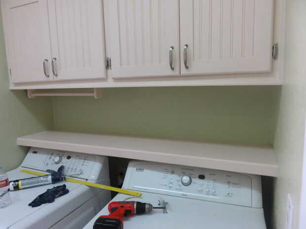 Agregué un estante justo por encima de los aparatos y un lugar para almacenar perchas justo debajo de los gabinetes. Realmente ayuda, especialmente al doblar ropa.