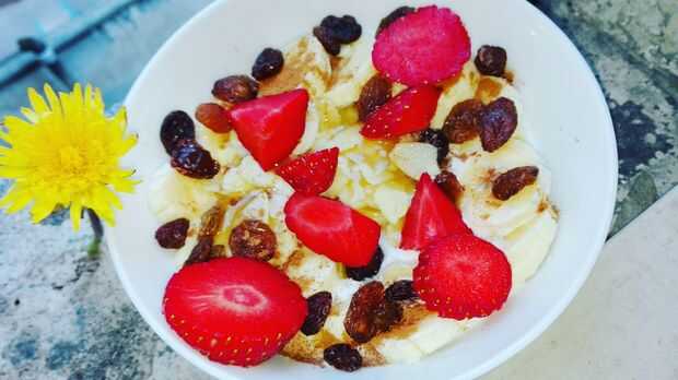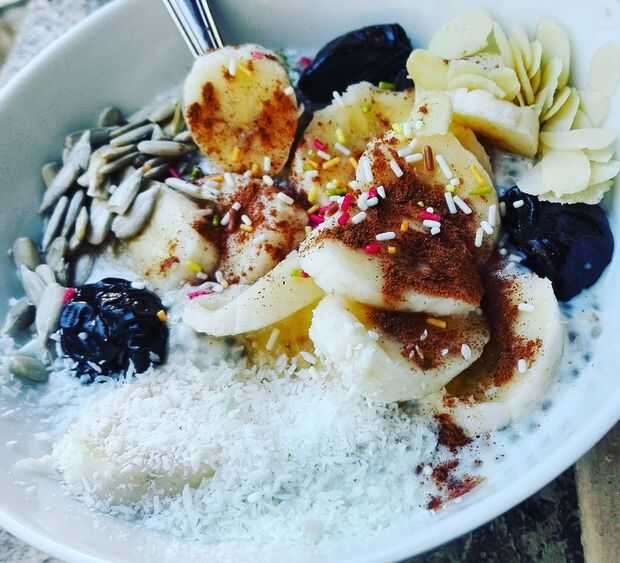 3) banana, canela, ciruelas, semillas de girasol, rodajas de almendras, coco rallado y funfetti (virutas de azúcar de colores)