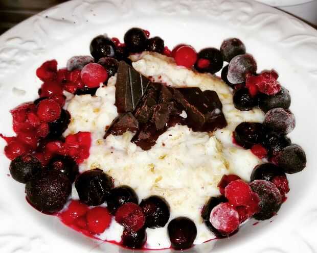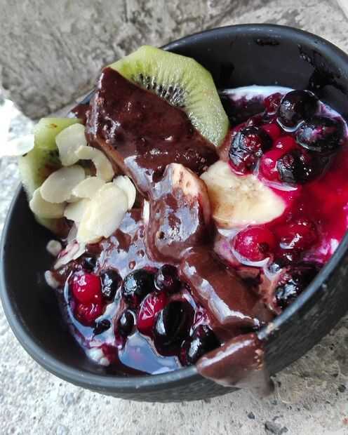 2) bayas jam (bayas trituradas con miel) con la fruta de kiwi, rodajas de almendras, plátano y chocolate negro fundido.
