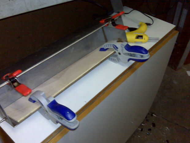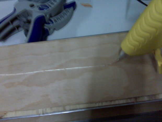 Usar una pistola de pegamento caliente, tiras de capa de la parte posterior de la madera contrachapada con abundante pegamento. Sujete las tiras en el interior de la caja y deje que el pegamento fijar. Lo dejé toda la noche, pero eso es sólo porque ya me canse.