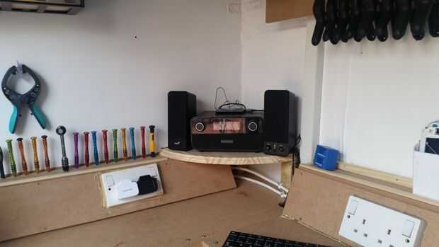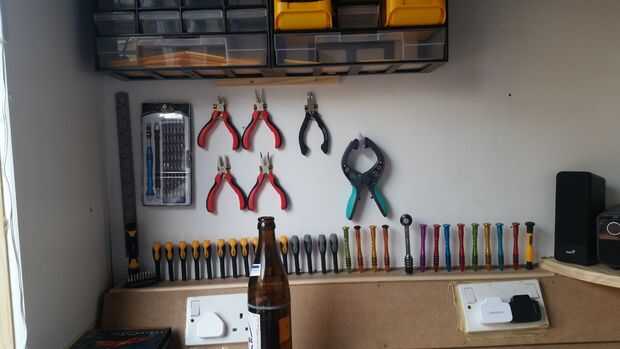 Se trata de un cubículo a la medida para organizar un lote de herramientas, suministros y un banco de trabajo de electrónica / área de laboratorio. Tuve que vivir fuera de casa por diez meses (en un apartamento pequeño, barato, estudio pequeño,) debi