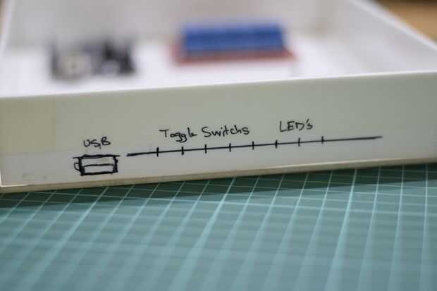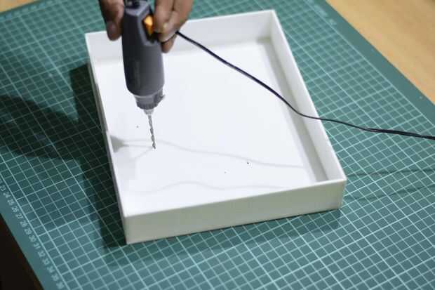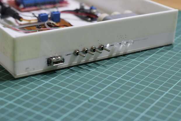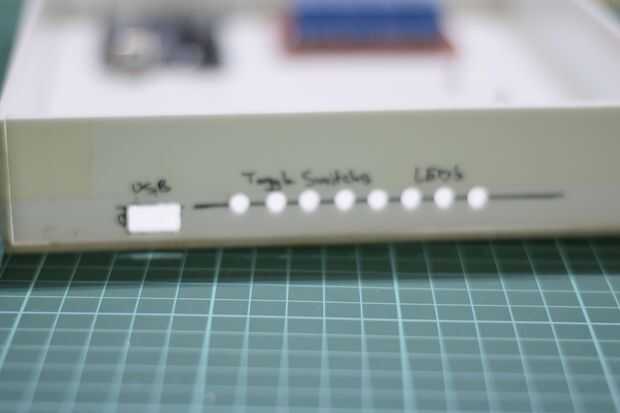 Perfore agujeros para los interruptores, leds y USB. Marque la ubicación de los agujeros. Sólo marcaron puntos separados 1 cm y los perforados. Para el USB, tienes que taladrar los agujeros múltiples y afinarla usando un archivo.