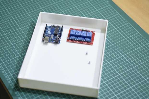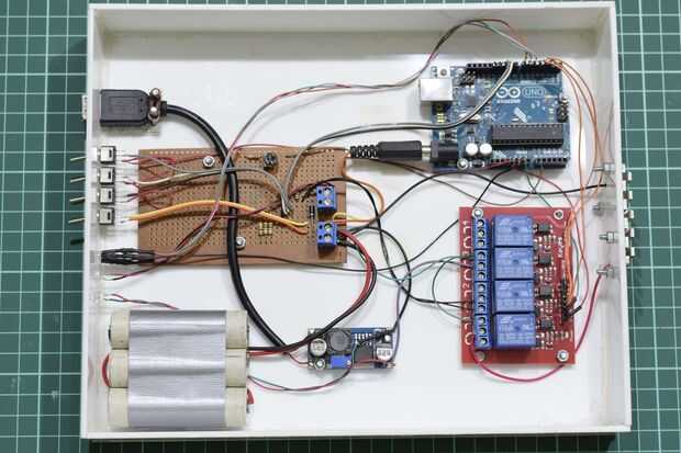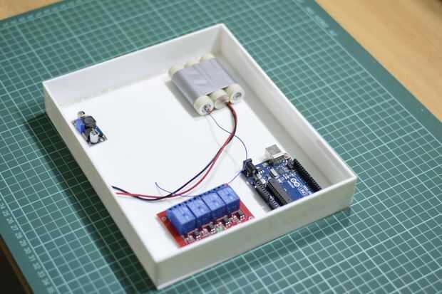 Una vez que se realizan todos los agujeros y componentes asegura, tienes todo de alambre. Enchufe el conector de DC en el arduino. Los motivos de la LED y la salida del alambre. Conecte las salidas y entradas de arduino. Fije la batería con cinta de doble cara. Quite las conexiones de arduino y conecte la batería. Prueba de todo. Asegúrese de que los interruptores están trabajando bien y dando el resultado deseado. Debe comprobarse la salida del divisor de tensión. Una vez todo bien, conecte las conexiones de arduino. Encender el interruptor de encendido debe girar en la placa Arduino y el relé. Si no, entonces Verifique todas las conexiones y compruebe el circuito.