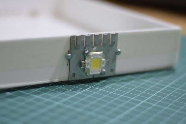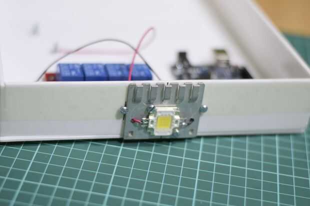 Tenemos que montar los componentes grandes en el plexiglás. Así que coloque el arduino, el módulo de relé, módulo de carga, perfboard. Puesto que como mantener en vista el lado LED y panel de control. Marque los orificios y perfore les. Sujete los componentes usando las tuercas. Para el LED, perfore y asegure el disipador de calor del lado que desee. Taladrar y fijar el LED en el disipador de calor. Pase los cables a través de dos agujeros de otro.
