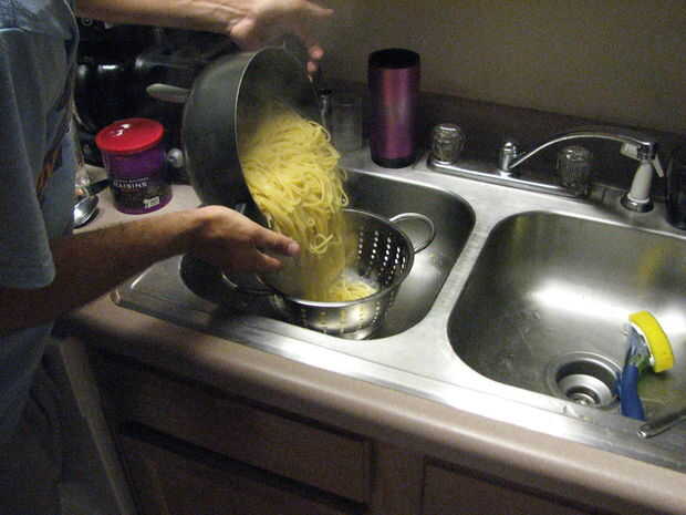 6. Vierta con cuidado hacia fuera los espaguetis de la bandeja de cocción en el colador (reloj hacia fuera para levantar el vapor).