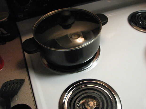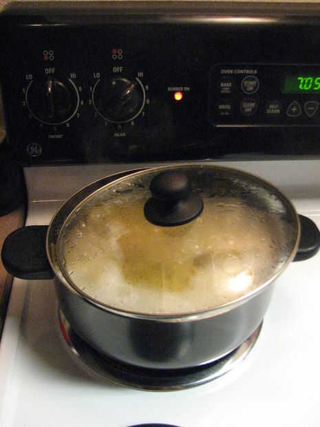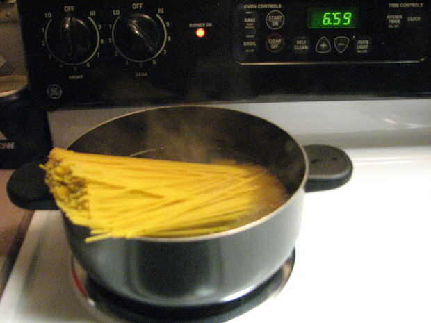 1. poner 4 cuartos de galón de agua por libra de espaguetis a hervir (212o F) encima de la estufa.