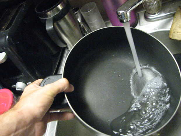 4. mientras tanto, coloque un recipiente filtrando en el fregadero y el recipiente más grande de cerca al lado.