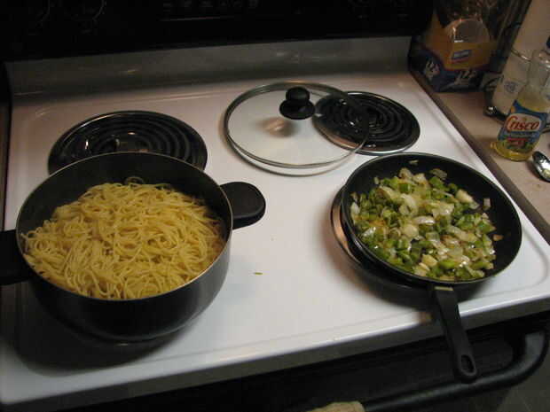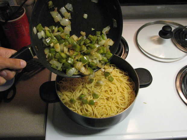 1. Añada las verduras cocidas para el tazón de mezclar con los espaguetis cocidos. Revuelva.