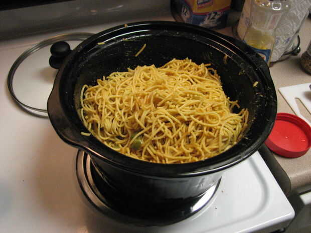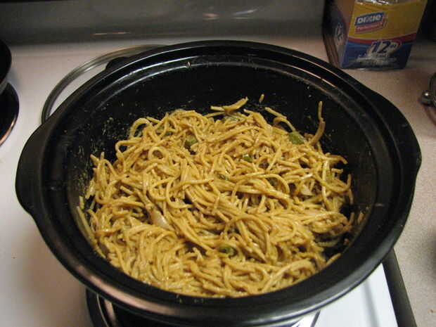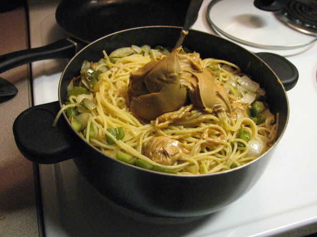 2. mientras los espaguetis y verduras son todavía caliente, agregue la mantequilla de maní. El proceso puede llegar a ser desordenado, pero calor derretirá la integridad estructural de la mantequilla de maní, facilitando la mezcla en espagueti.