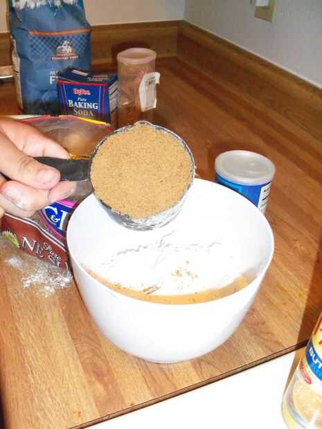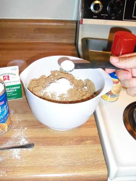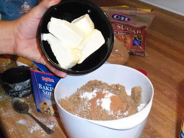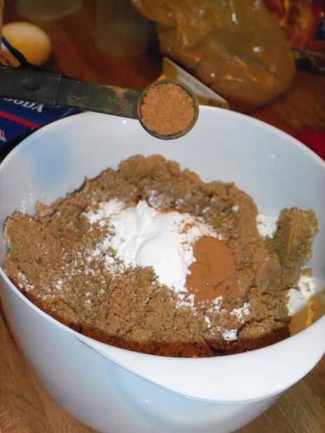 2. en un tazón mediano, combinar harina, azúcar morena, mantequilla blanda, sal, polvo de hornear, bicarbonato, canela y nuez moscada.