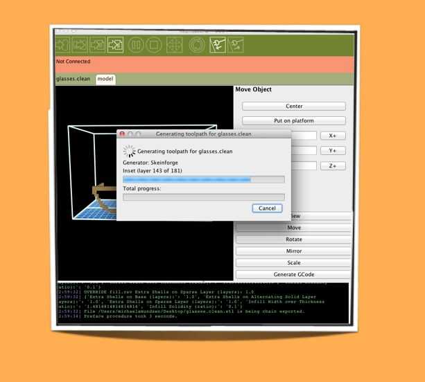 El paso final era tomar el archivo .obj de exportación en un programa de impresión 3D que prepararía el código para la impresión con la impresora 3D en Techshop. Ese programa se llamaba ReplicatorG. En este programa usted puede mover y escalar el objeto para el tamaño de impresión deseado. Intenté hacer una impresión del tamaño que necesitaría para poder usarlos. Terminó siendo unas 15 veces el tamaño del modelo original.
