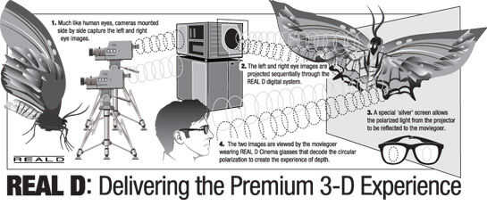 La mayoría de las salas de estos días está utilizando la tecnología "3D pasivo". Las gafas tienen lente polarizada radialmente, uno derecha, uno hacia la izquierda. La imagen en la pantalla se proyecta a través de dos lentes polarizadas, una vez más, hacia la derecha, uno hacia la izquierda. Las gafas permiten que la luz del solo proyector para llegar a cada ojo, por lo tanto, cada ojo ve una imagen ligeramente diferente, creando el efecto 3D.