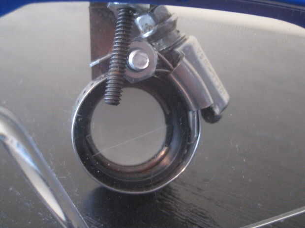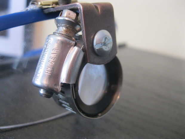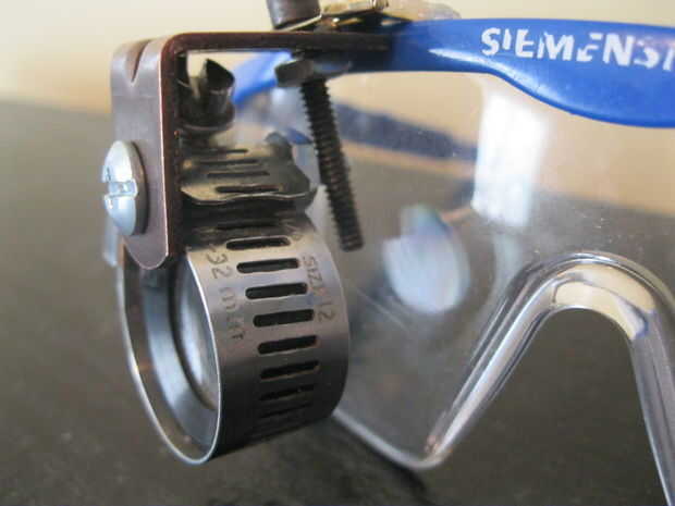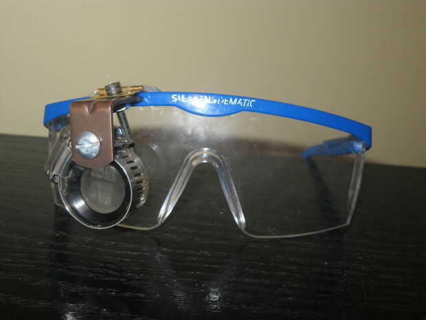 no tenía nada que hacer en un viernes por la noche, así que pensé que sería tratar de construir algo útil... Después de cavar a través de mi taller y utilizando una buena 30 minutos, había hecho unas gafas con una lente, así que puedo mirar detalles demasiado pequeños para verlos sin aumento. No voy a incluir las instrucciones o una lista muy detallada de partes, es solo una idea que me gustaría aunque compartiría. Empecé con la lente; no sé donde lo tengo, tal vez de un ocular de telescopio viejo, roto. Había encontrado una abrazadera y había atado alrededor de la lente, luego poner un tornillo con un soporte en L en ella por la parte del cierre todavía fuera y ajustar la hebilla y doblarse hasta que el tornillo me alojé en el lugar, asegurándola con una tuerca. Luego, tomé una pequeña bisagra había tendido alrededor y perforado un agujero en la mitad del mismo por lo que pude poner un tornillo que, otra vez, asegurándolo con una tuerca. Finalmente, usé pegamento caliente para fijar el otro lado de la bisagra a las gafas. Y poof! Una lente de unas gafas de seguridad. Se mueve hacia arriba y hacia abajo, por lo que no siempre tienes que mirar a través de él.