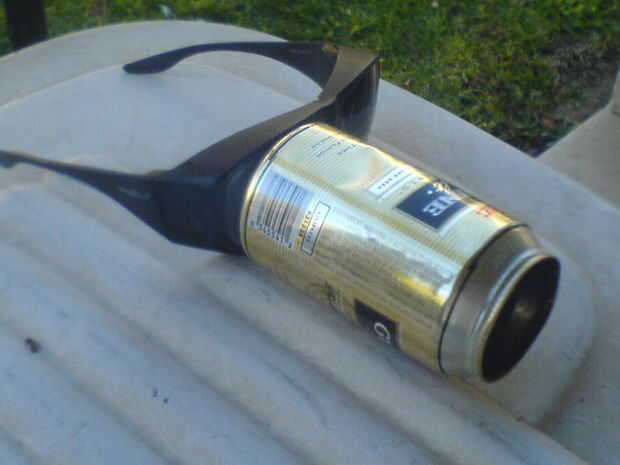 Pegar la parte inferior de las latas de cerveza a las lentes de las gafas de sol usando pegamento de Krazy o la pistola de pegamento caliente.