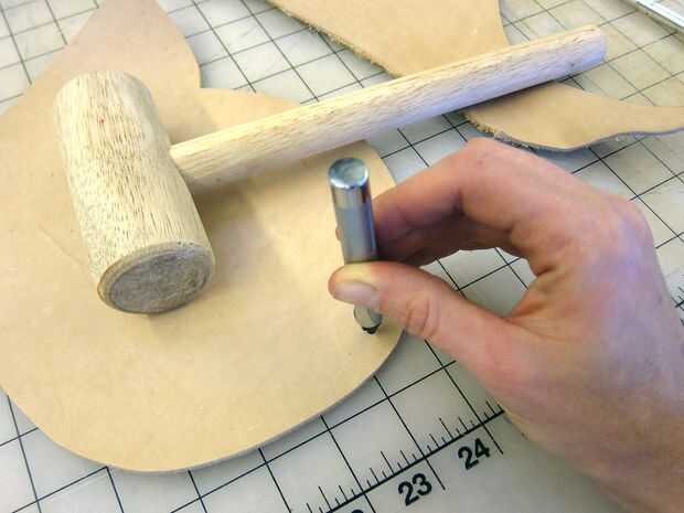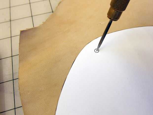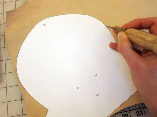 Imprimir el patrón en el último paso en tabloide papel y traza sobre su piel con un punzón, colocaciones de broche de presión, remaches y stitchline de la marca. Cortar con una cuchilla x-acto y perforar los agujeros para remaches. Recomiendo dejar el agujero para el cierre de la tapa frontal para el final, para asegurar una colocación perfecta si se trata de su primer uso de este patrón. Usar un golpe de 3mm para los agujeros en la caja y un punzón de 4mm para los agujeros en el puente de la nariz.