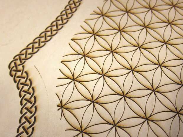 Tuvo que hacer muchas pruebas en la piel para obtener la configuración de la trama correcta y había notado que varió considerablemente entre estos dos diseños no podía ejecutarlos juntos. En un láser de 120 vatios, la corrí el celta nudos a velocidad 80 / 9 el poder y la flor de la vida a velocidad 80 / 15 potencia.