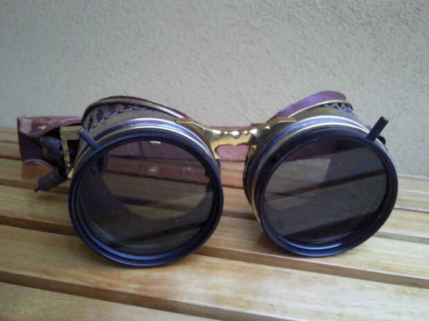 Después de tener una pieza para cada ojo era combinarlos y obtener una correa. He intentado soldar mis partes pero como tengo sólo los posibles con la lata did´nt trabajo... Me tuvieron que hacer de la manera difícil - filework y utiliza algún metal de impresión tipográfica. Como I´m una impresora que i´ve tiene algunas piezas de latón tribuanles había utilizado como líneas de tipografía y formado el contoures para estas gafas facilmente por fileworking. Al menos hice algunos leatherstraps con los resortes (por el mejor look) como veis en las fotos.