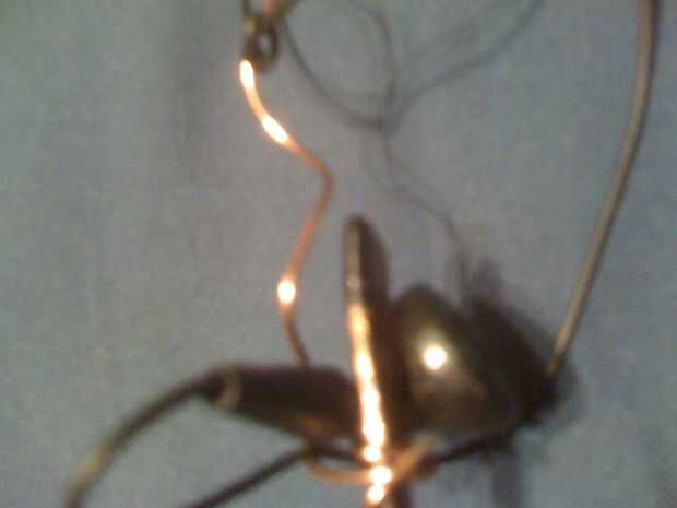 Paso 2. atar el cobre alrededor de las piernas de los vidrios, luego inserte los extremos de los auriculares hacia abajo con el faceing de cable hacia abajo, atan a las patas y gire el cable alrededor del cable, hacer primero el lado sin la turbina, lo mismo al otro lado. Tienes algunos sobre la cuerda izquierda, rap alrededor del interruptor de la luz.