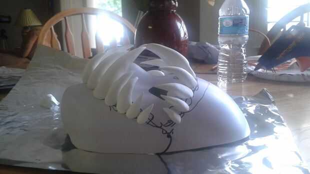 Pegamento caliente los dientes donde deben ir, otra vez trabajando desde el centro hacia los bordes. Una vez que los dientes estén todos en, empiece a construir cuidadosamente pegamento caliente alrededor de los bordes para formar "labios" o que se vea como los dientes están saliendo realmente de la piel. Usé un palito para sacar el pegamento caliente caliente lejos del borde para hacer una mezcla áspera en el resto de la máscara. Lo verás en el siguiente paso.