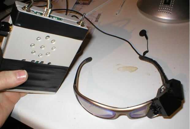 Caja izquierda contiene el tablero del circuito del receptor de video, la placa de circuito de la unidad de control de mano para las gafas de video Olympus, una batería de 9V de las pilas receptor y 6X1.2V videos para alimentar los circuitos de Olympus Eye-Trek(TM).