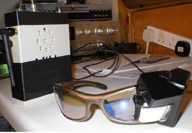 La pequeña placa de circuito y un sistema de óptica de las gafas de vídeo se montan en las gafas de seguridad a la derecha.