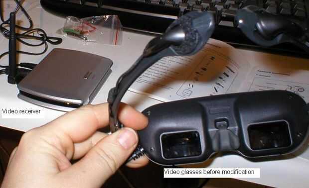 Aquí vemos el receptor de video en caja a la izquierda y la no modificados Eye-Trek gafas parte inferior derecha.