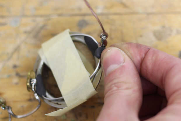 Presione los tamices en el marco de los vidrios. Objetivo de línea de las salchichas de sugru con las uniones en la estructura, es decir, donde el brazo del templo y el puente encuentran los bordes de la lente.