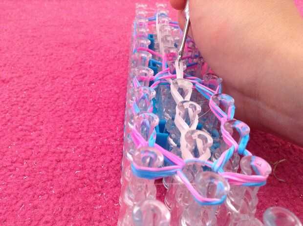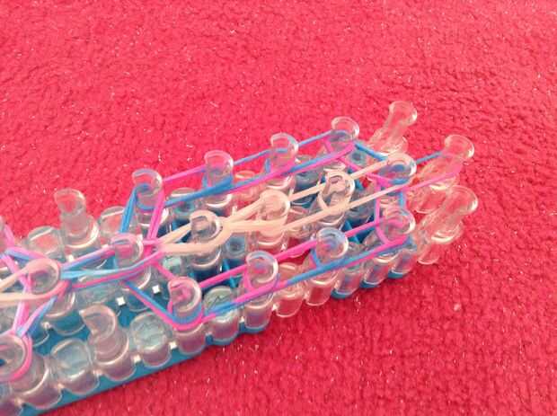 ahora a partir de la parte inferior pone el gancho en el centro de la clavija y tire de las dos primeras bandas entonces seguir enganchando hasta llegar le tenía gafas mirando como esta en la foto.