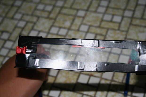Corte el plástico transparente a la forma. Utilice cinta adhesiva para pegar en el soporte de la lente (barras azules)