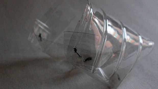 Cortar 4 rebanadas (aproximadamente en 1 o 2, 5 cm) en el plástico del animal doméstico que se pueden doblar los bordes sobre sí mismas, como si estás haciendo la mitad de una caja. Donde se superponen los bordes, poner dos pequeños agujeros en el plástico con sus cuchillo/tijeras y unirse a ellos con una longitud corta del alambre. El plástico PET todavía quiere rodar juntos pero debe claramente definidos lados ahora.