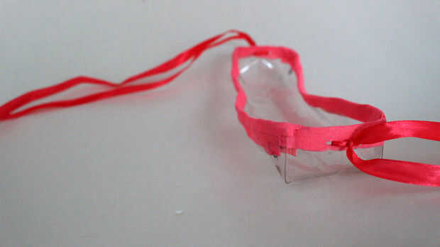 Haga dos agujeros en los lados cortos de la gafas y deslice una longitud del material de la correa a través de ellos para que tengas dos pedacitos de cinta que usted puede atar detrás de la cabeza.