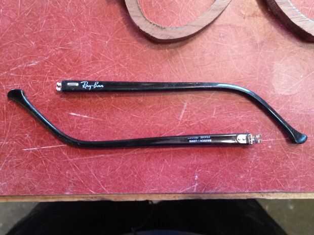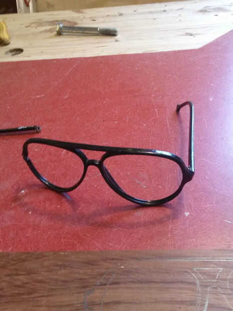 Este primer paso es un poco de un triste. Desarmar el viejo par de gafas de sol asegurarse de no rayar las lentes y para mantener las bisagras a los lados. Yo mi caso conseguí un viejo par de RayBans de buena voluntad por unos 2 dólares. Pude separar fácilmente los marcos usando cortadores de alambre pero puede variar desde un par a par.