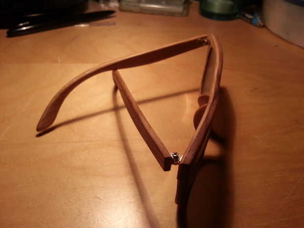 O usted puede comprar un par de "gafas de sol de plástico baratos" con bisagras de metal y las bisagras de la loot. Esto es lo que he hecho con casi todas las parejas que he hecho. La excepción es cuando usé las bisagras de resorte en el par de roble, pero esto no fue un éxito. Porque las bisagras carecían de una superficie de fricción, por tanto, las bisagras no se pegaron a la madera.