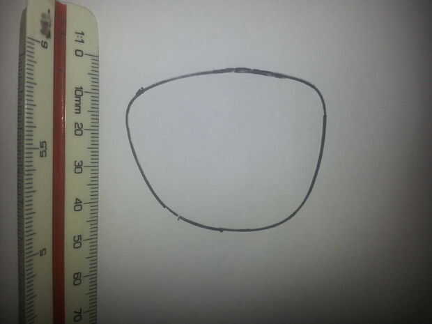 Se trata de cómo transfirió la forma de las lentes en cad... Empieza por tomar tu lente, presione hacia abajo en un pedazo plano de papel, luego traza alrededor de él con pequeños de la pluma/del lápiz. (ver imagen) Coloque una regla sobre el papel, luego tomar una foto. La imagen se utilizará para proporcionar la escala correcta en el programa de CAD más adelante. En su carga de programa de CAD la imagen en JPG, esto es posible en la mayoría de programas CAD. Cuando tengas tu dibujo en cad, hacer una referencia la misma longitud que su regla de la línea. Entonces la escala de la imagen así que la línea que trazaste es la misma longitud que la regla. Ahora tienes a escala 1:1. Ahora todo lo que queda es para trazar sobre la foto que subiste.