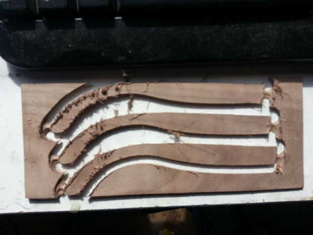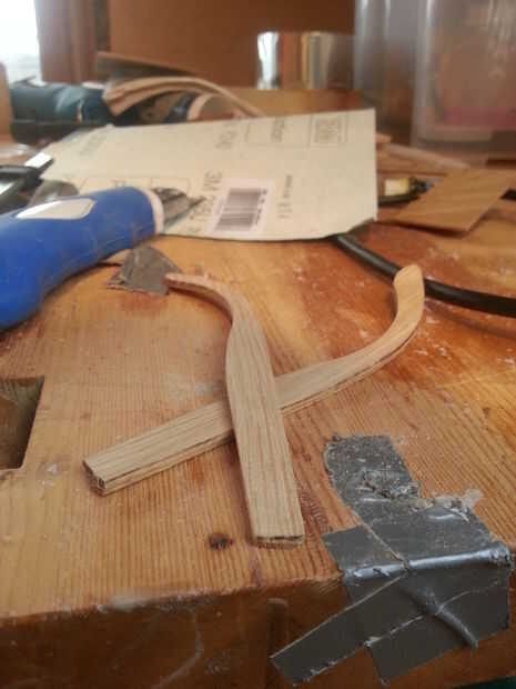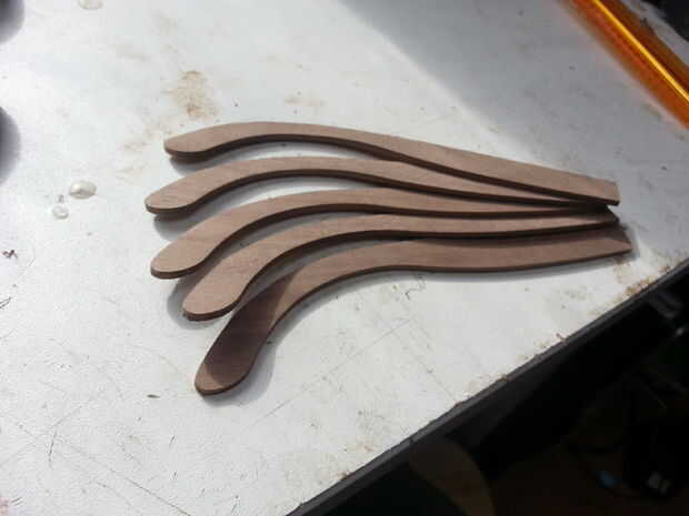 Mantener en los pernos de la mente los dos deben ser imágenes de espejo de las del uno mismo, para no hacer dos con la misma curva. Lo genial es que los pasadores forman naturalmente una leve curva hacia el final debido a la rigidez de torsión de la madera causada por la dirección de grano en el laminado.