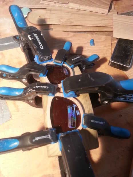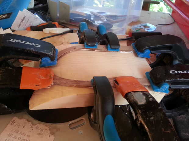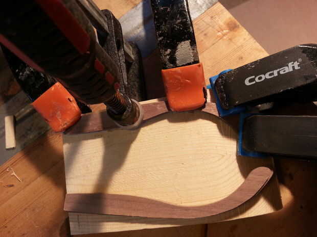 Empezar por hacer un molde con la curva preferible, un ejemplo mostró en fotos más abajo, el ancho del molde calzado ser alrededor de 60mm. Sólo cortar un tablón con una leve curva. Cuando pegar le aplica pegamento para madera a piezas pelea de madera, y mantenerlos juntos para hacer el palillo del pegamento. Pero no utilizar demasiado pegamento podría obtener muy resbaladizo cuando aplique las abrazaderas. Las pinzas que se utilizan son las pinzas de madera con resorte estándar. Comenzar aplicando una pinza en el extremo plano de las clavijas, tratar de no hacer el resbalón de dos piezas fuera de la alineación. Entonces aplique más abrazaderas para sujetar firmemente las piezas de molde. Intente quitar el exceso de pegamento para evitar que la forma de madera pegado al molde.