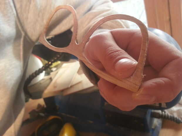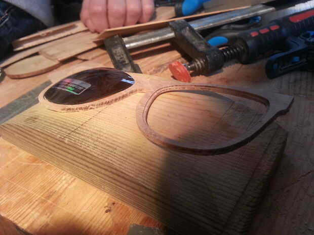 el marco consiste en seis diferentes piezas de madera, dos piezas intercala a hacer juntos cada una de las dos "patillas". Y dos piezas intercala a junto con las lentes entre que constituyen el marco principal.