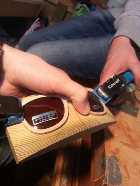 Añadir cinta a las lentes para evitar que pegamento pegar y arañazos que se formará. Al pegar, hacer la pieza de 2,4 mm con el contador del fregadero la pieza posterior y la pieza plana la pieza frontal del marco. Esta orden funciona mejor. Pegado del marco sólo es difícil, pero más simple con un amigo (recomendado). Agregue el pegamento a la pelea de las piezas de madera, use pegamento tan poco como sea posible para evitar que las piezas se deslicen y derramando sobre las lentes de la forma del pegamento. Pegamento para madera normal puede raspar de las lentes de dejar de fumar fácilmente. Coloque las abrazaderas para sostener todo junto.