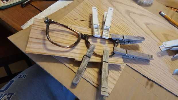 Elegí un barniz roble blanco porque me gustó la forma en que veía con mi lente marrón. Usted tendrá que fallar desenrollo el tamaño de sus marcos. luego Lije levemente sus marcos para que el pegamento tenga una mejor superficie de palillo para luego aplicar pegamento al frente de sus marcos. Suavemente Coloque sus marcos en la chapa y utilizar la ropa para apretar hacia abajo. Dar el pegamento unos minutos que se seque antes de tocarlas otra vez.