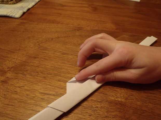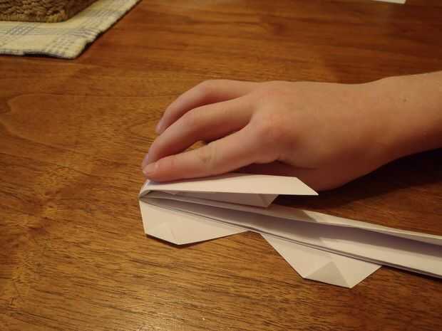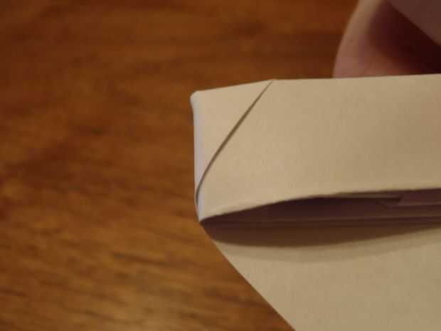 Por último, doblar los triángulos pequeños en cada uno de los triángulos más grandes como se muestra. Después de ello, doblar ambas líneas flacos hacia el interior, asegurándose de que mantenga rectas las lentes. Ahora debería verse como se muestra en la foto.
