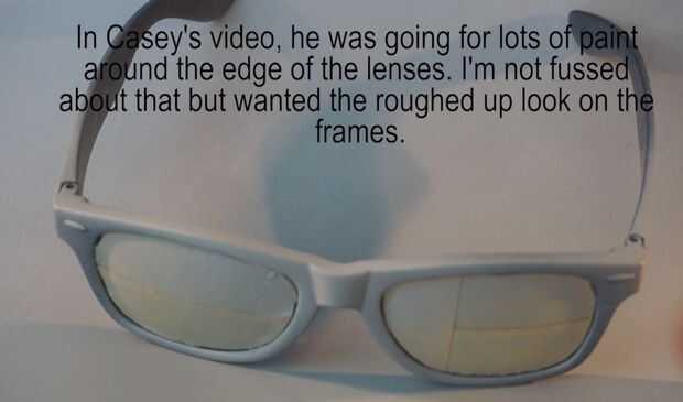 Ahora aquí tienes algunas opciones en cuanto a qué estilo que usted desean. Quería una especie de acabado liso que pude rayar lejos en el más adelante pero si (como Casey) desea que una acumulación de pintura en los bordes de las lentes entonces necesitas rociar un montón de pintura en las lentes por lo que filtra alrededor de los lados. Si quieres que se vea como mis gafas entonces corta fuerte arroja a chorros de la pintura puede lograr un buen acabado liso.