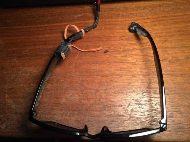 Pensé en ponerlos en un par de gafas de sol. Pensé en diferentes formas de montaje y cómo podia hacerlo discretamente. Consiste en un par de gafas de sol con un collar de alambre que pasa por debajo de su camisa. La batería cuelga del collar. Las gafas de sol no tomes el conductor óseo el hueso muy bien así que puse una goma en el extremo de las gafas de sol que fijo que.