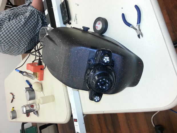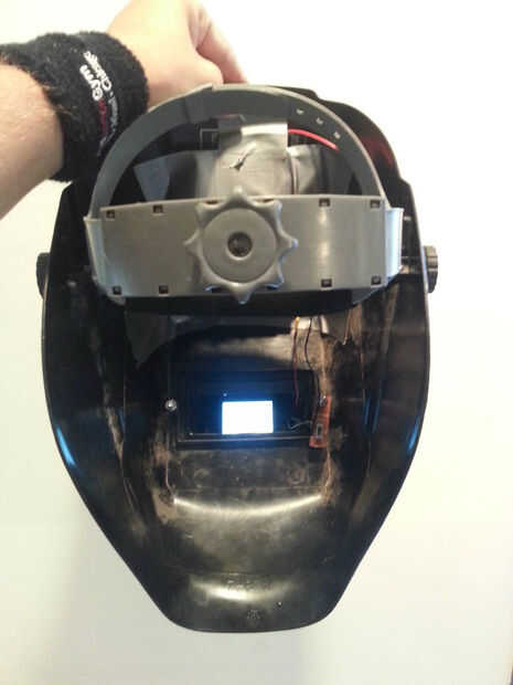 Utilice un trozo de cinta aislante negra en la cara de la máscara para eliminar cualquier luz que se escapa de punto de encuentro superior de sección de la máscara y electrónica