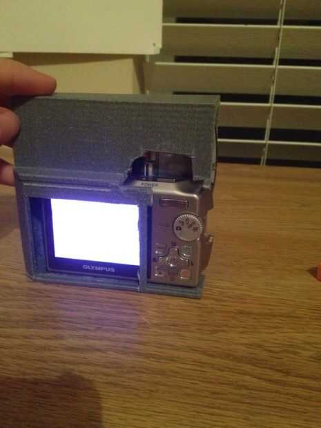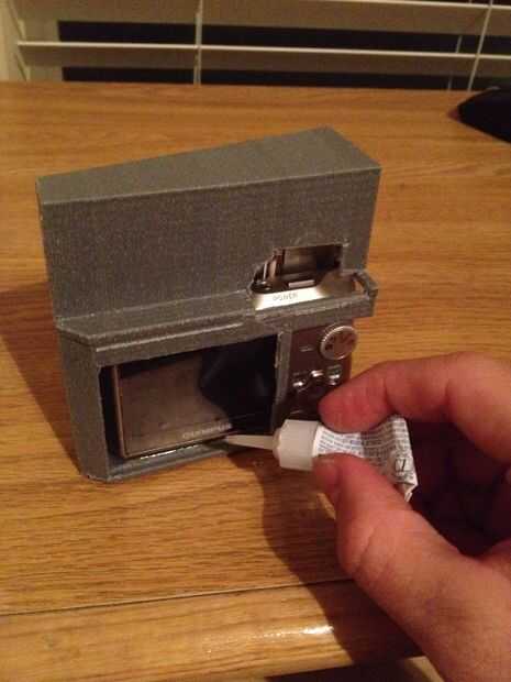 Después de hecho el cuadro inserta la cámara en la caja y pegué en. Asegúrese de que tiene fácil acceso a los botones y que todo funcione suavemente antes de que pegue la cámara. Tuve que hacer algunas modificaciones a mi caja de la cámara así que corte algunas partes de mi caja para asegurar un buen ajuste porque mis medidas eran un poco apagado.