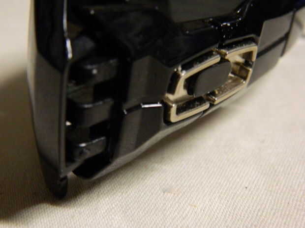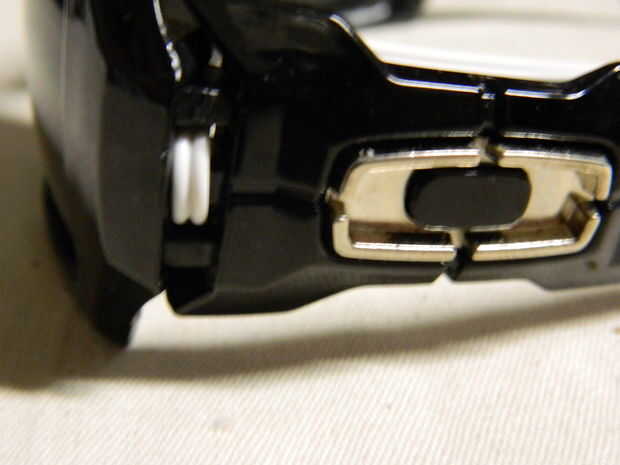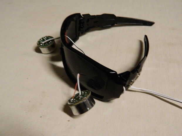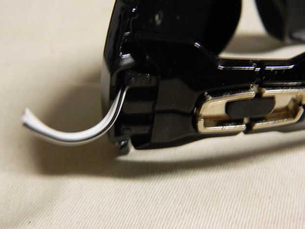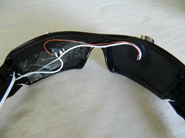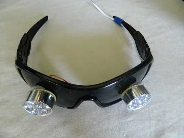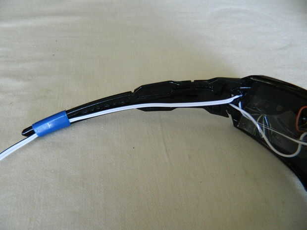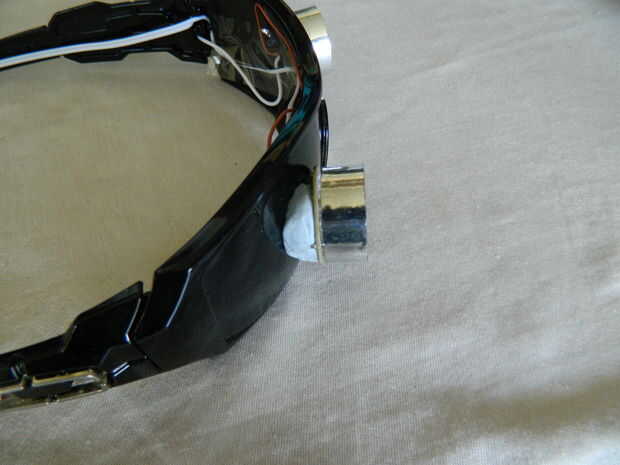 Los dos módulos de LED conectados en serie (Recuerde 9V fuente y 4V5 módulos) y atados al frente con más "BluTack". Los cables fueron grabados luego abajo dentro de la lente para prevenir daño de ojo, junto con el trozo pequeño de cinta encima de la oreja para llevar el cable a la caja de control.