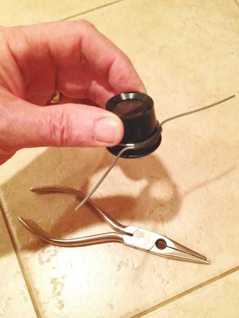 Usar un secador de pelo o una pistola de calor a la tubería del encogimiento para que el hilo no se deslice hacia adelante y hacia atrás para abrir el círculo. Hacer un pequeño doblez del cable como sea necesario para que el círculo se ajuste la base de la lupa tanto como sea posible. Al doblar el cable del calor encogen tubería sufrirá menos daños si las mordazas del alicate se mantienen entre la tubería y la curva. Doblar los extremos en la forma mostrada.