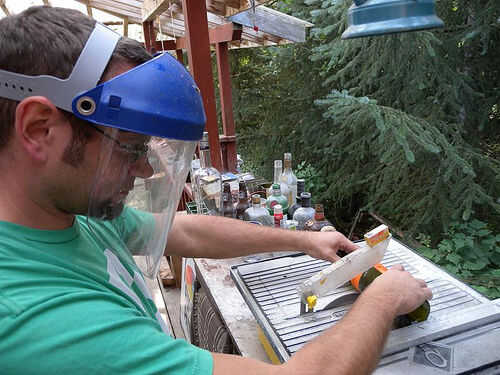 Asegúrese de que hay agua en la cuenca de la sierra. Don tus orejeras protección cara escudo y oído. El interruptor y luego gire con cuidado la botella en la plataforma, rodar la botella en la hoja con la base contra la valla. Se concentran en mantener la botella perpendicular a la hoja. Gire con cuidado hasta que estés cerca del corte a través. Suavemente Sujete el cuello de la botella para que el peso no causa la botella a esfuerzo cortante en el pasado pocos milímetros.